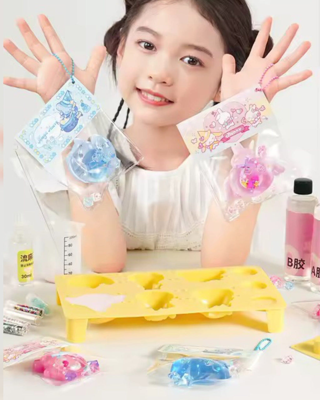 Com ele, os pequenos podem moldear sua própria geleia líquida e criar animazinhos fofos, que depois podem ser decorados com brilhos, tintas e outros acessórios. Cada passo da brincadeira estimula habilidades importantes, tornando a diversão também educativa.